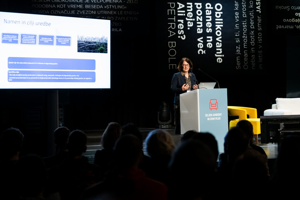 Prvi del dogodka je bil posvečen predstavitvam uredb EU iz Zelenega dogovora, ki so za gozdno-lesni sektor izredno pomembne. Simona Vrevc iz Ministrstvu za kmetijstvo, gozdarstvo in prehrano je predstavila uredbo EU o proizvodih, ki ne povzročajo krčenja gozdov ali krajše EUDR uredbo. Sledila je Gabriella Kemendi, generalna sekretarka European Furniture Industries Confederation, ki je predstavila  Uredbo EU o okoljsko primerni zasnovi za trajnostne izdelke (ESPR), zelo pomembni za pohištvena podjetja. Prvi del dogodka je zaključila Darja Virjent iz svetovalne družbe Ernst & Young Slovenija, ki je predstavila uredbo EU o poročanju podjetij o trajnostnosti (CSRD).